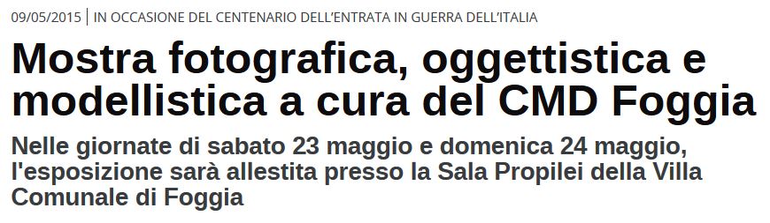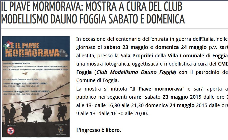Maggio 2015 MOSTRA COMMEMORATIVA “e il Piave mormorava……” Pubblicato davpad5230 aprile 202030 aprile 2020Pubblicato in: Senza categoria in collaborazione con il “Comitato un monumento a ricordo delle vittime del ’43 a Foggia” Condividi: Fai clic per condividere su X (Si apre in una nuova finestra) X Fai clic per condividere su Facebook (Si apre in una nuova finestra) Facebook Mi piace Caricamento... Correlati